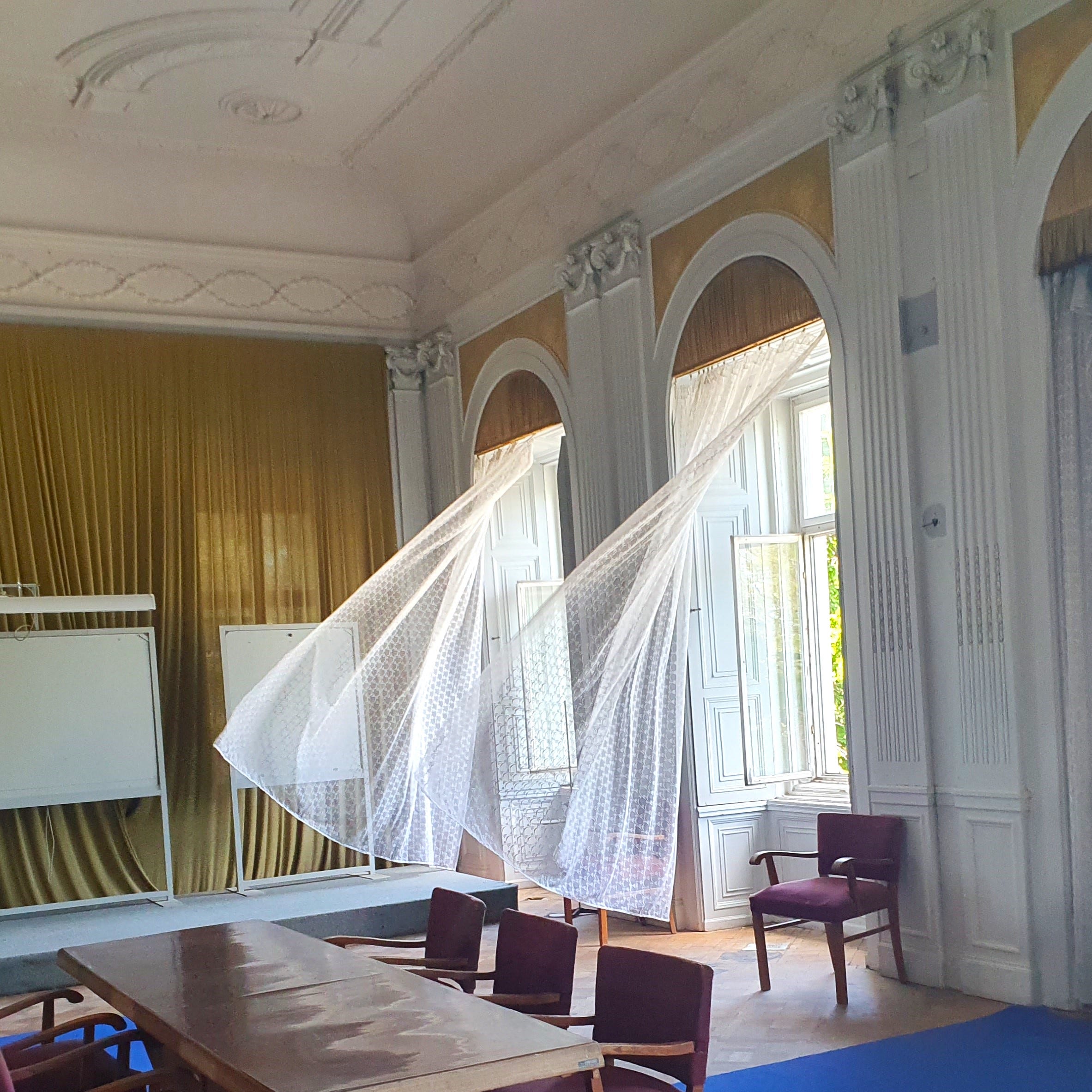 The building stands at a crucual time in its 180 year history. At the moment, several layers of its past are visible simultaneously. Stepping inside, you can see its nineteenth century fireplaces, the original staircase with its red marble walls, the beautiful mosaic floors in the hallway outsite the entrance to the ballroom where Heydirch and his family would once have held social gatherings. But you can also see the remains of the postwar technical institute that was housed here – the workshops, the functional offices, the huge boxes of electrical cabling. Many of the walls and ceilings are adorned with beautiful plasterwork; while others are covered in functional tiles and peeling paint. Walking around this place is a spooky experience. Heydrich’s ghost is not the only presence here. There are other ghosts too, left over from the Communist times.