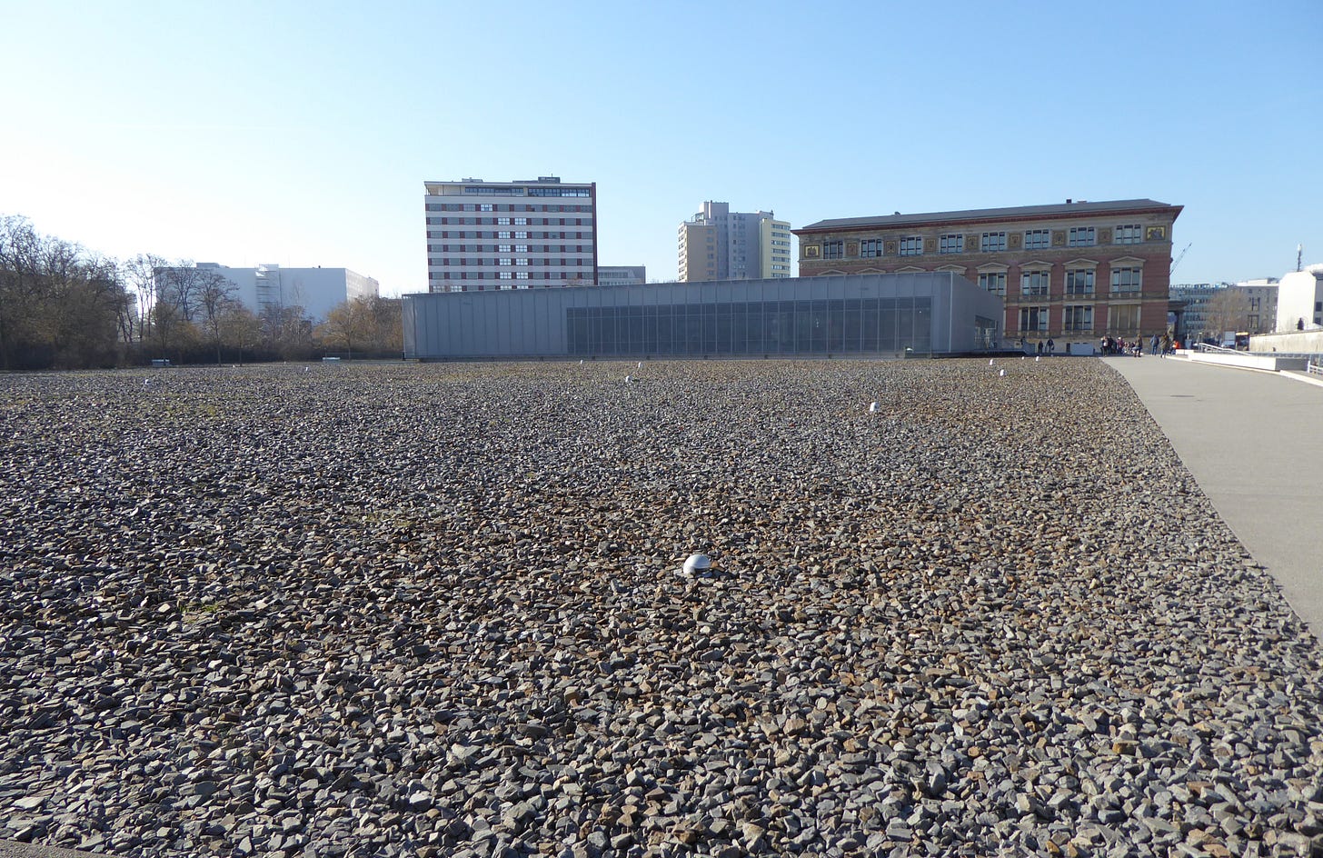 No attempt was made to commemorate what had once stood here until after the fall of the Berlin Wall in 1989. It has since been converted into a memorial site and information centre called “The Topography of Terror”. But at its heart is still a feeling of absence. The main memorial site is deliberately and ostentatiously empty. Where once stood the offices devoted to terrorising the people, there is now a field of rubble. Nothing is allowed to grow here. There is not a single plant or blade of grass: it is completely barren. This is the legacy of Nazism: death, emptiness, nothingness.