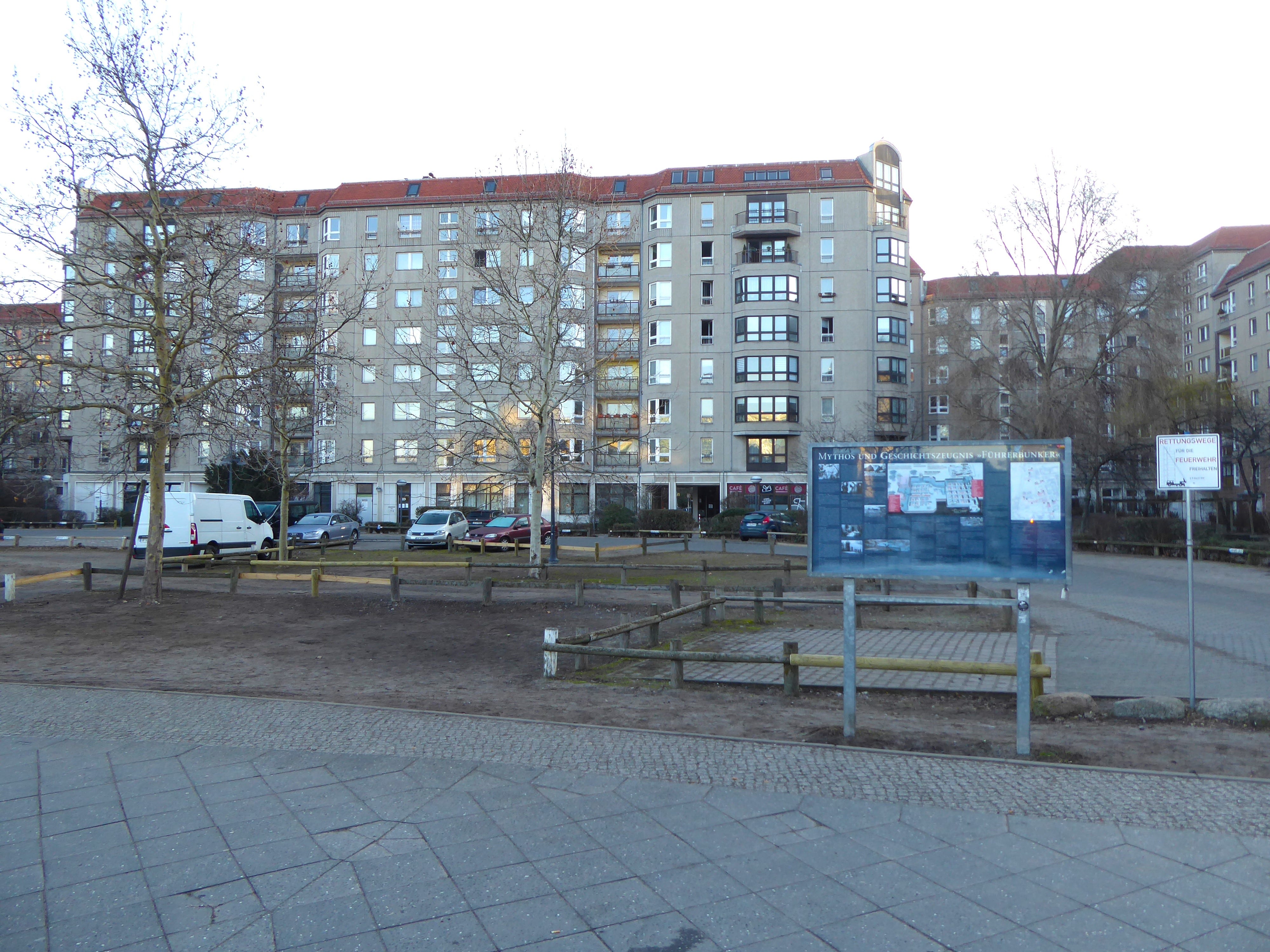 In the 1980s, the East Berlin authorities decided to remove all outward signs of what lay beneath the ground. They erected an apartment complex on the site of the old Reich Chancellery: while they were digging the foundations, they also removed the concrete roof of the bunker and filled the entire structure with gravel, sand and other debris. The area was levelled and a car park planned on top of it. As far as the eye could see, all traces of the bunker had gone.