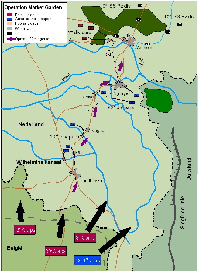 But the British commander, Field Marshal Montgomery, suggested something different. Rather than go through the Siegfried Line, why not bypass it altogether? The Germans had not built such heavy defences at the northern end of their border because they did not feel that they needed to. The Netherlands was criss-crossed by several huge rivers – the Maas, the Waal and the mighty Rhine – which were formidable barriers in their own right. But if Montgomery could somehow secure the bridges over these rivers, he would have a straight run into northern Germany. His plan was to drop tens of thousands of airborne troops around these bridges to secure them (Operation Market), and then send a ground force up through the Netherlands to link up with them (Operation Garden). Easy.